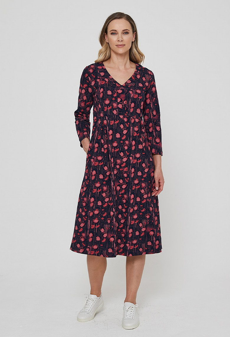 Hand-painted abstract floral design in warm red tones available in dress & top shapes from Adini Autumn Winter 2022 collection. Sold by my agent Lisa at Coco Bloom.
